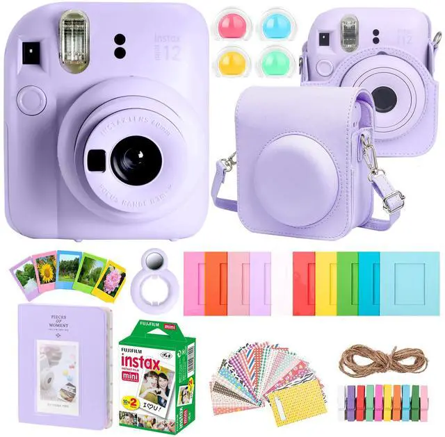 FUJIFILM INSTAX MINI 12 INSTANT FILM CAMERA (LILAC PURPLE) + COMPLETE ACCESSORY KIT FOR FUJIFILM INSTAX MINI 8/9/11/12 CAMERA CASE, PHOTO ALBUM, FRAMES, STICKERS & LENS FILTERS (PURPLE) + FUJIFILM 2X10 FILM MINI INSTAX FILM PACKFUJIFILM INSTAX MINI 12 Instant Film CameraDedicated to the joy of living in the moment, the INSTAX MINI 12 Instant Film Camera provides easy-to-use controls and quickly produces memorable credit-card-sized photos. Offered here in pastel blue, this instant camera is ready to go with a simple twist of the lens. A close-up mode and selfie mirror make the camera perfect for portraits and self-portraits and the camera's automatic flash system allows you to get shots in dimly lit environments.
