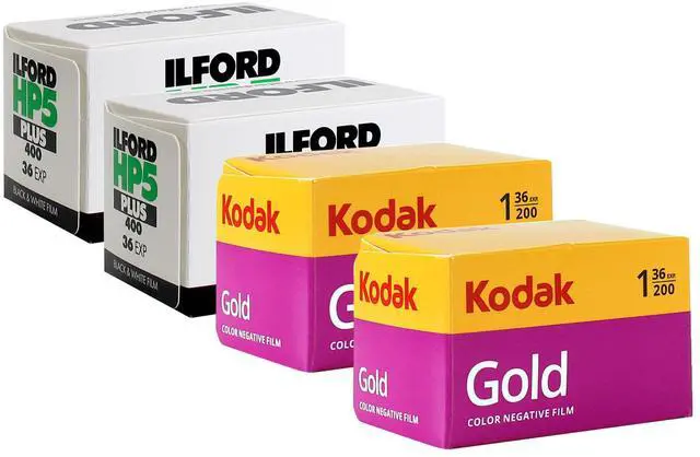 2X ILFORD HP5 PLUS BLACK AND WHITE NEGATIVE FILM (35MM ROLL FILM, 36 EXPOSURES) + 2X KODAK GOLD 200 COLOR NEGATIVE FILM (35MM ROLL FILM, 36 EXPOSURES) Ilford HP5 Plus Black and White Negative Film (35mm Roll Film, 36 Exposures)Ilford's HP5 Plus Black and White Negative Film is a traditional and versatile panchromatic film designed for general use in a wide variety of shooting conditions. Exhibiting notably wide exposure latitude, this film responds well to use in mixed and difficult lighting and provides medium contrast for greater overall control. It has a nominal sensitivity of ISO 400/27° when developed in standard black and white chemistry, and responds well to push processing. HP5 Plus is a flexible film type that is ideally suited for use in general photographic applications in an array of different lighting conditions.