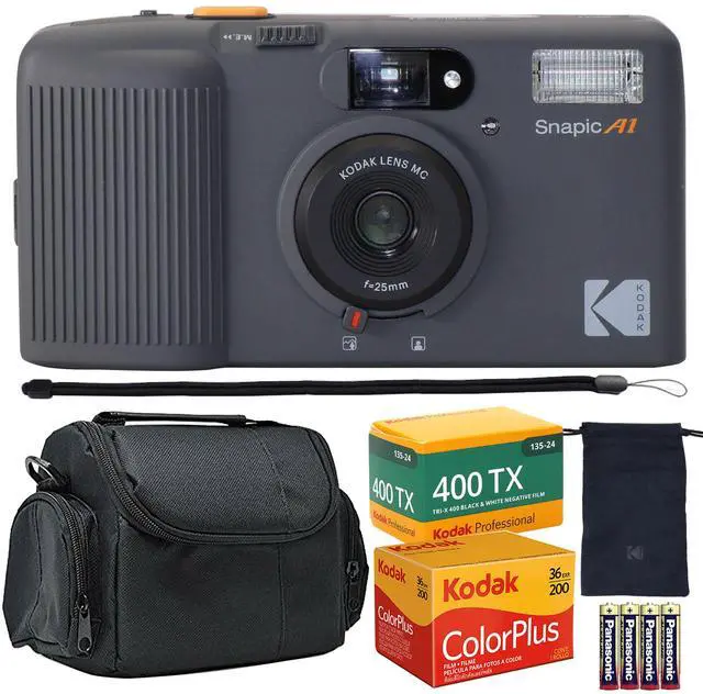 KODAK SNAPIC A1 35MM FILM CAMERA (RHINO GRAY) + KODAK COLORPLUS 200 COLOR NEGATIVE FILM (35MM ROLL FILM, 36 EXPOSURES) 6031470 + KODAK PROFESSIONAL 400TX TRI-X 400 BLACK & WHITE NEGATIVE FILM - 24 EXPOSURES (1590652) + 4X ALKALINE AAA BATTERIESKodak Snapic A1 35mm Film Camera (Rhino Gray) A modern point-and-shoot 35mm film camera with a 25mm glass wide-angle lens, the Snapic A1 35mm Film Camera from Kodak is a compact daily carry for capturing memories on the go. The two-zone manual focus allows for a quick adjustment between landscape and close-up settings, and a built-in flash makes proper exposure in dim lighting possible.