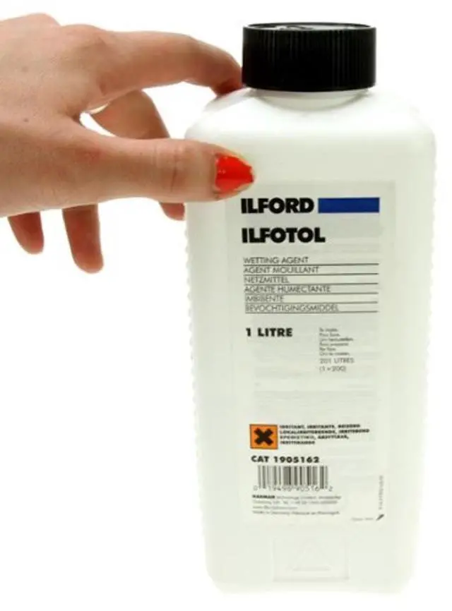 Ilford Ilfotol is a non-ionic wetting agent used as a final rinse before drying films. It can be used in all manual and machine processes to aid rapid even drying and so greatly reduce the risk of drying marks being formed. Ilfotol can also be used as a final rinse before drying fibre based prints, again it promotes rapid, even drying. Additionally it can be used to clean glass and plastic lenses and filters and as an antistatic treatment.