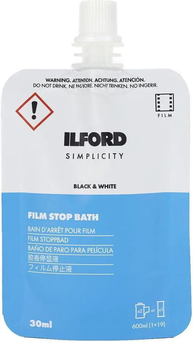 ILFORD SIMPLICITY Film Stop Bath is available as single sachets, multi packs of 5 sachets or as part of a Starter Pack containing 1 x film developer, 1 x stop bath, 1 x fixer, 1 x wetting agent.