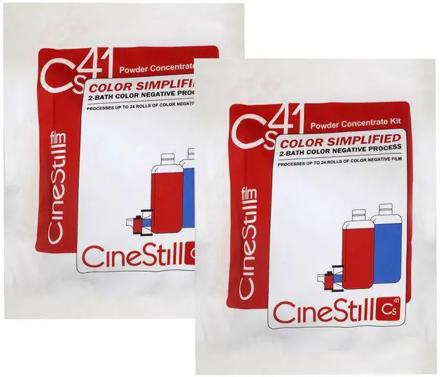 CineStill Film Cs41 Powder Developing Kit for C-41 Color Film The Cs41 Powder Developing Kit from Cinestill is designed for processing your own C-41 chemistry, color film at home. It includes two chemistry bath processing mixtures that makes 33.8 fl oz, to process approximately eight rolls of 35mm x 36 exp. or 120 film. It can be used at a variety of temperatures with the same equipment you already process your black and white film with at home. This powder is designed to be used with water, a thermometer, and a simple developing tank (available separately). The final mixture is reusable for up 24 rolls of film.