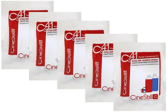 CineStill Film Cs41 Powder Developing Kit for C-41 Color Film The Cs41 Powder Developing Kit from Cinestill is designed for processing your own C-41 chemistry, color film at home. It includes two chemistry bath processing mixtures that makes 33.8 fl oz, to process approximately eight rolls of 35mm x 36 exp. or 120 film. It can be used at a variety of temperatures with the same equipment you already process your black and white film with at home. This powder is designed to be used with water, a thermometer, and a simple developing tank (available separately). The final mixture is reusable for up 24 rolls of film.