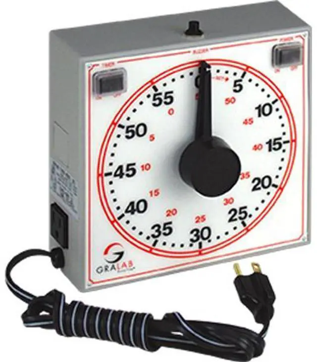 The 6 1/2", easy-to-read white dial has large black numerals and an inner circle of red numerals that can be read at a glance from a court or playing field. The red numerals let you use the timer as a minutes-and seconds-elapsed time indicator or stopwatch. The case is made of durable plastic. It's strong, withstands high impact, resists moisture and is electrically non-conductive. A recessed hand grip in the back and rubber base pads provide multiple mounting options. Input voltage is 100 to 130 VAC, 50 or 60 Hz (U.S. And Canada). For timers requiring higher voltages for other countries, contact GraLab. 3-Wire plug fits all standard grounded sockets.