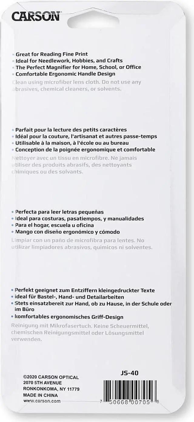 Carson JS40 is a compact, easy to use, 2x power HandHeld Series Magnifier for home, school or office. Its crystal clear acrylic lens gives you a sharp distortion-free view and a 5.5 x power bifocal lens allows you to see even the finest details with ease.