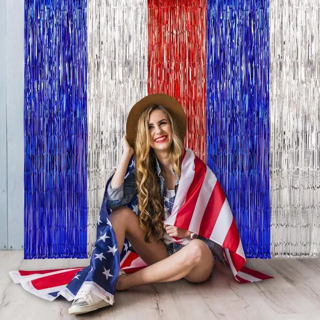 TINSEL MATERIAL : The patriotic theme metallic foil fringe curtain is made of tinsel with a shiny surface and lightweight durable metallic fringe curtains. High-quality fringe curtains, high toughness, unbreakable, and can be used for a long time.