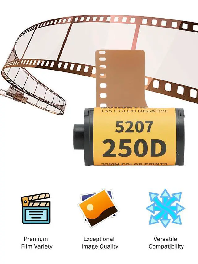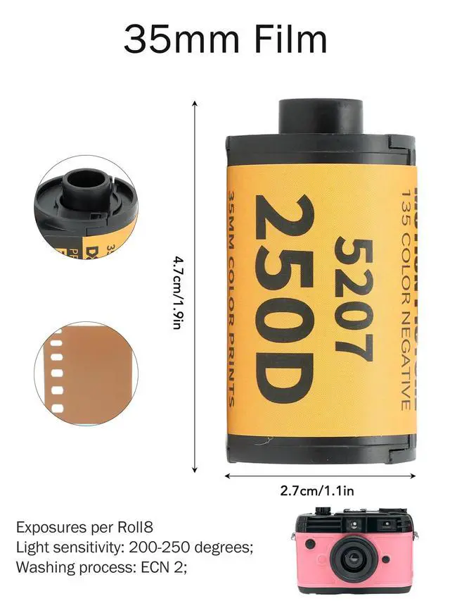 Product Specifications: Film roll size: 3.58 x 2.48 x 1.42 inches; Light sensitivity: 200-250 degrees; Washing process: ECN 2; Suitable for 135 Camera