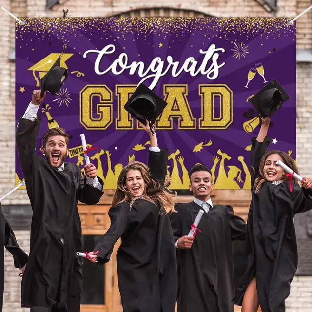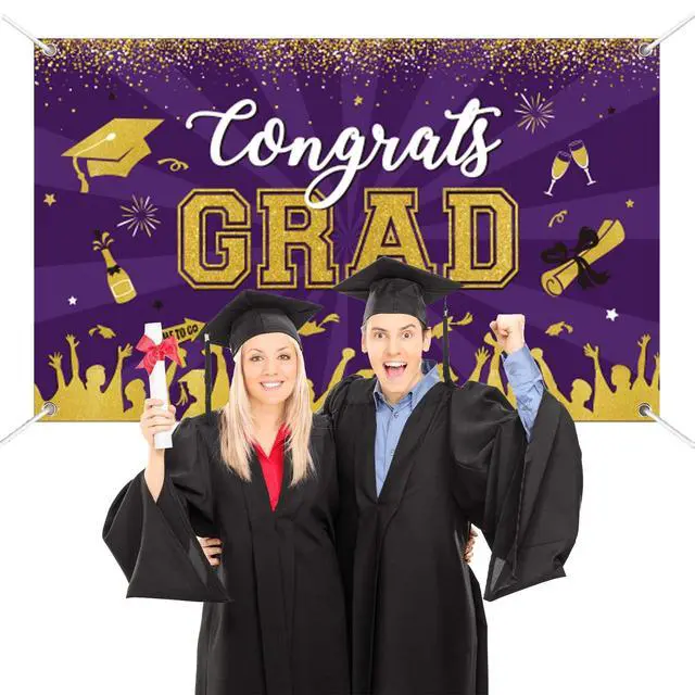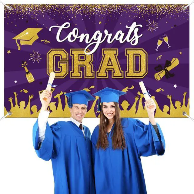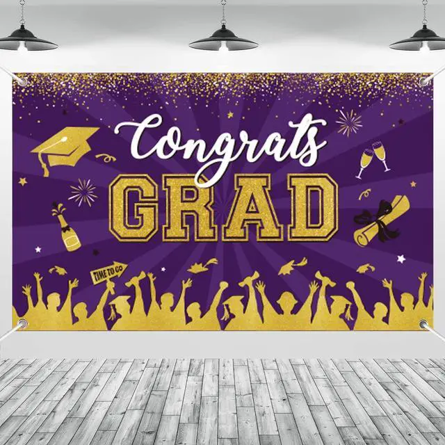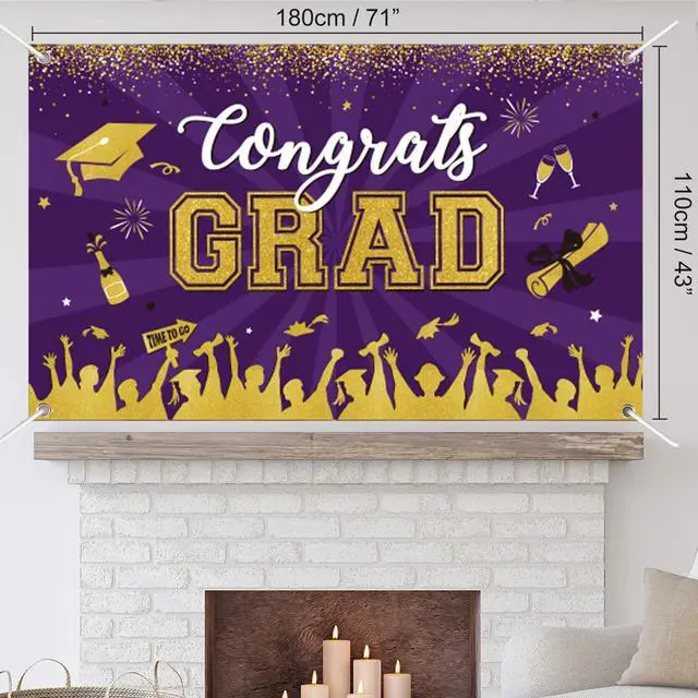 Graduation party suppliers The eye-catching purple congrats grad banner measures 71 x 43 inches and can be used as a party wall decoration, outdoor graduation banner, courtyard garage door decoration, graduation photo backdrop, and signature wall, making it great for college, high school, doctorate, and kids' big celebrations.