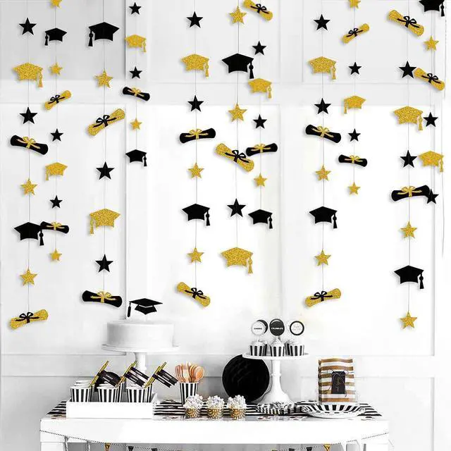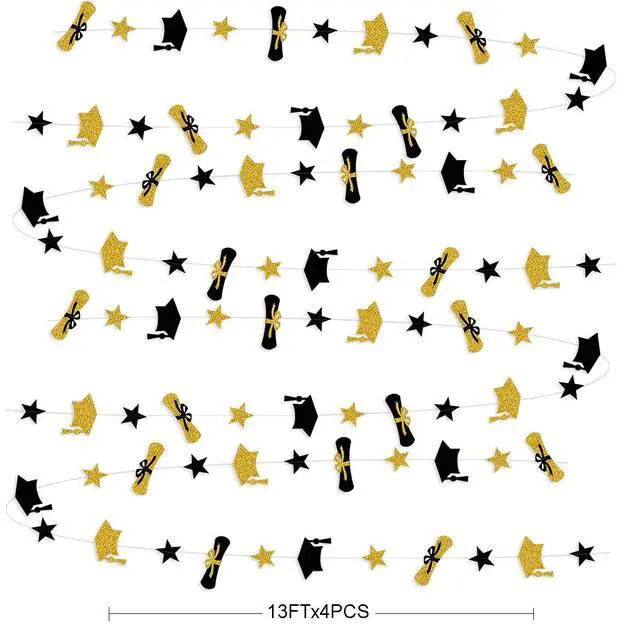 Package Include: 4 strings of 13 feet black gold graduation cap diploma star banner garland, totally 52 feet. Great for graduation party decorations!
