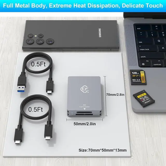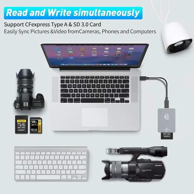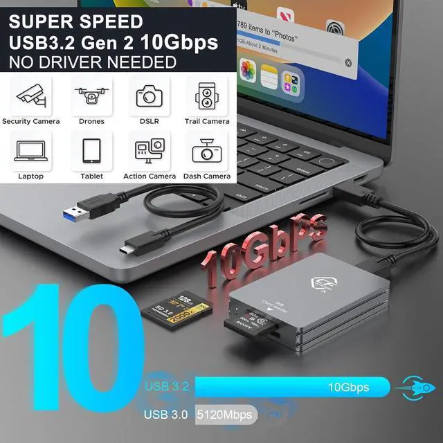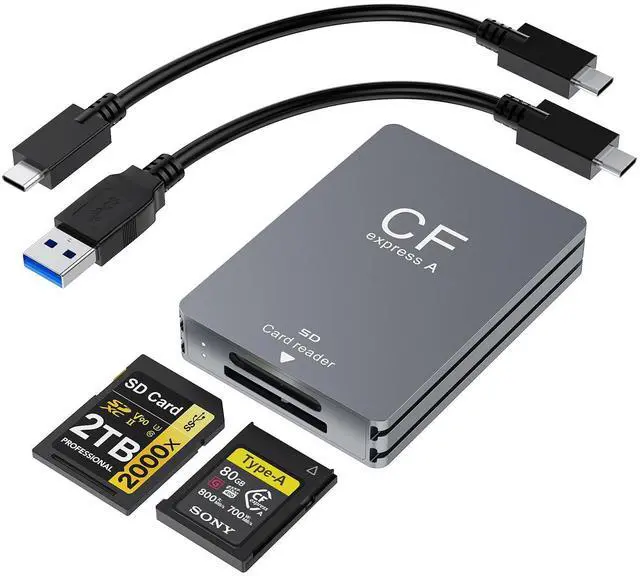 The dual slot CFexpress Type A and SD/SDHC/SDXC/UHS-I/UHS-II/MMC reader uses the new USB 3.2 Gen 2 interface with the ability to read CFexpress Type A and SDXC memory cards at speeds of up to 1.25 GBytes per second. This type of performance means you can download high-resolution photos, full HD videos from our CFexpress Type A and SD cards at over 1250MB per second.
