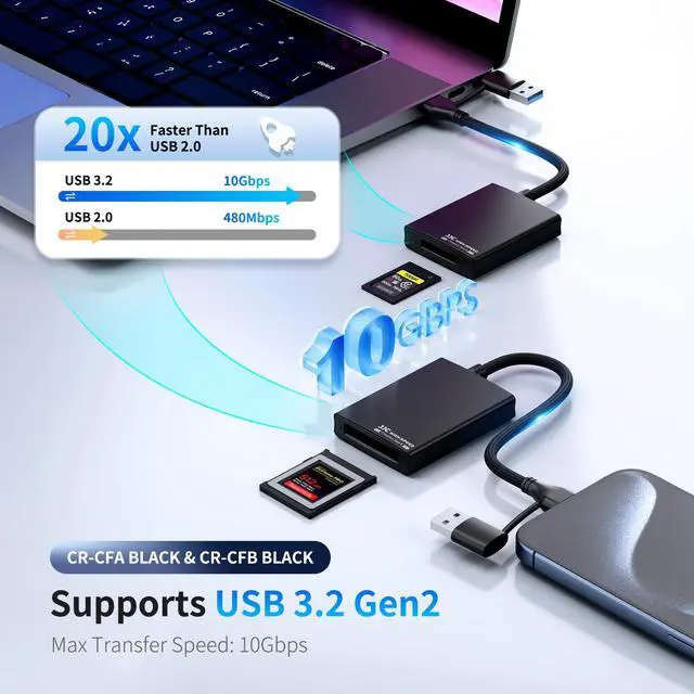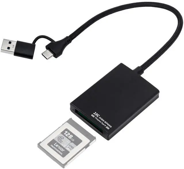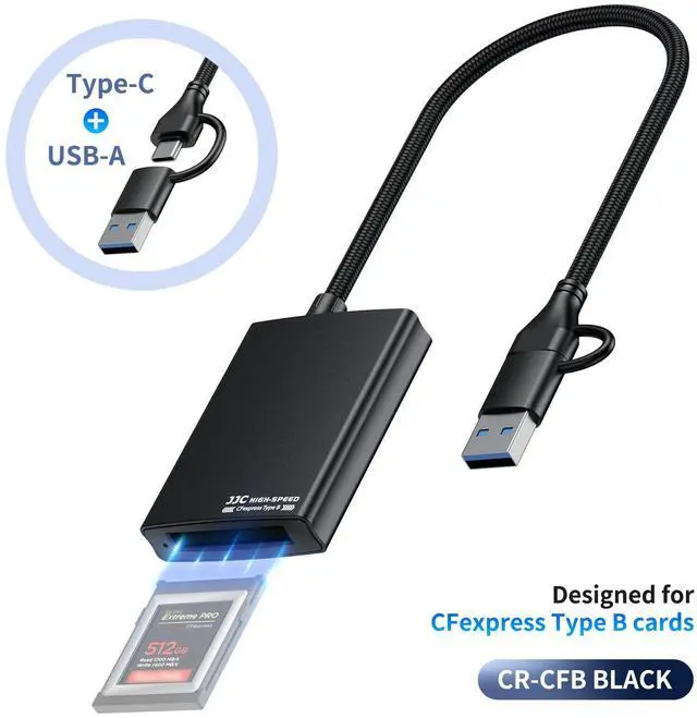 This card reader is designed specifically for CFexpress Type B cards, supporting USB 3.2 Gen2 with transfer speeds of up to 10Gbps for faster and more efficient data transfer. It features a dual-function plug with Type-C and USB-A, making it suitable for connection with desktop computers, laptops, and mobile phones, meeting the needs of different usage scenarios. The durable and compact aluminum alloy housing ensures effective heat dissipation, providing a reliable guarantee for the continuous efficient operation of the card reader. The USB-C auxiliary power input ensures a stable power supply to the device. It is plug-and-play, requiring no additional drivers, and offers broad compatibility with various systems including Android, Windows XP/Vista/7/8/8.1/10/11, Mac OS (including systems with M1 and M2 CPUs), iOS, and is compatible with Apple 15 series phones.