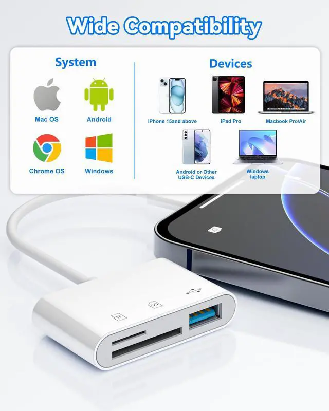 Is this SD Card Reader adapter compatible with iPad Pro, MacBook, Android phones, and Windows laptops?