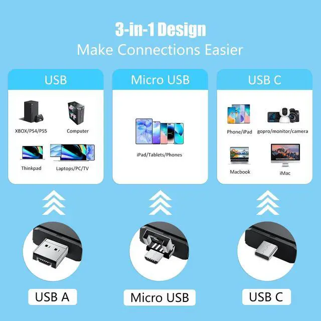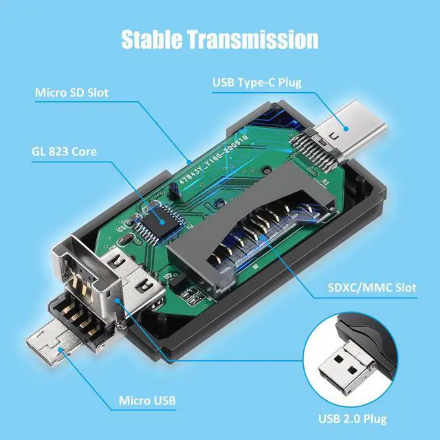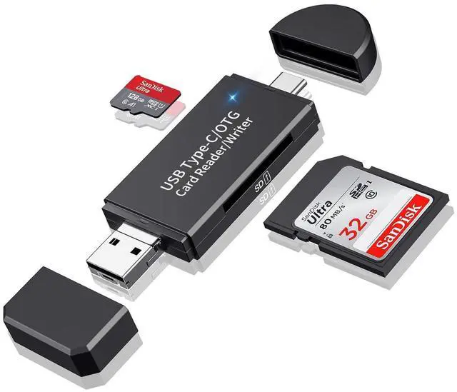 The SD card camera reader with 3 connectors, namely USB 2.0, Micro USB and USB-C connectors, compatible with all USB-C devices, laptops, tablets and Android smartphones that support OTG function. Dual card slot of the memory card adapter supports SD SD-3C SDXC SDHC MMC RS-MMC TF Micro SDXC Micro SD Micro SDHC card and UHS-I memory cards.(NOTE: MICRO USB IS INCLUDED IN USB-A)