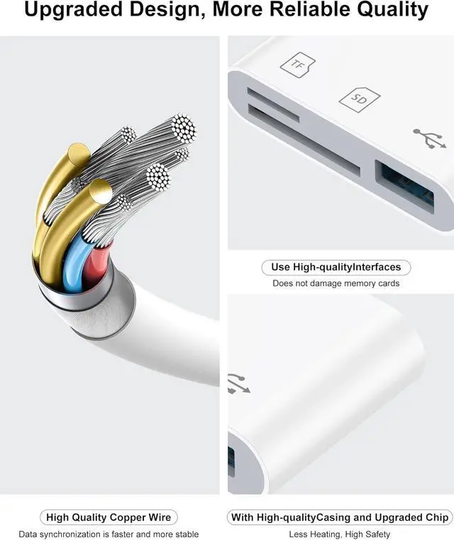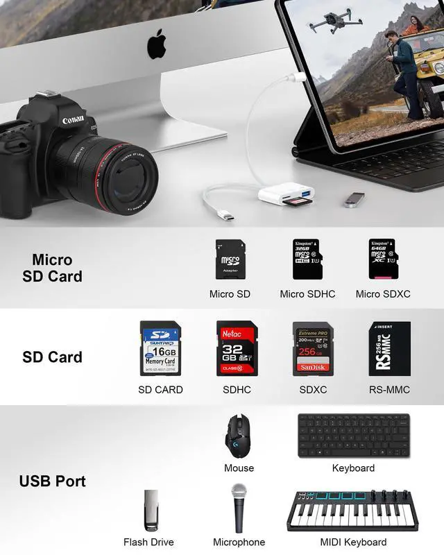 SD/TF and USB: This iPhone memory sd card adapter features two slotsSD/microSD (TF) cards and one USB port. The SD slot supports SD, SDHC, and SDXC cards, while the microSD slot is compatible with microSD, microSDHC, and microSDXC cards. The USB port can be used to insert USB flash drives, digital cameras, USB headphones, electric guitars, MIDI keyboards, mice, and more (not compatible with printers or hard disk drives)