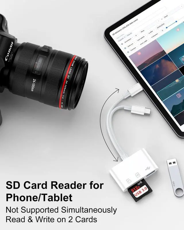 Plug & Play: Our usb camera adapter is a photography accessory for KODAK Canon Nikon DSLR digital hunting trail cameras. No additional apps or software needed. Simply plug the micro sd card reader into your Lightning devices, open the 'Photos' app, tap 'Import,' and effortlessly transfer videos and photos from your memory card to your iPhone or iPad(Warm tips: Not supporting 2 card read and written simultaneously)