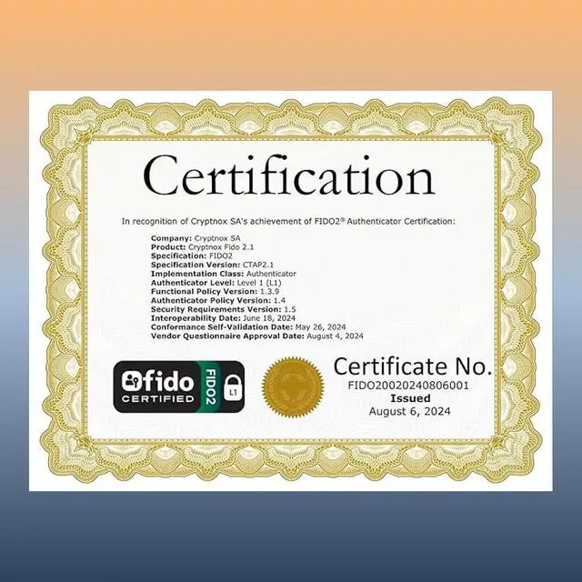 The Cryptnox FIDO card is Fido2 Level 1 certified. Cryptnox has been a member of the Fido Alliance at the associate level since 2020.