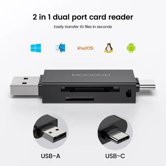 USB C and USB 2.0 card readers are used to read data from memory card and transfer it to OTG - enabled computer, tablet or smart phone. It supports data transfer speeds up to 480M Gbps . It can transfer a large number of photos and files in seconds, which avoids making you wait for a long time to transfer.