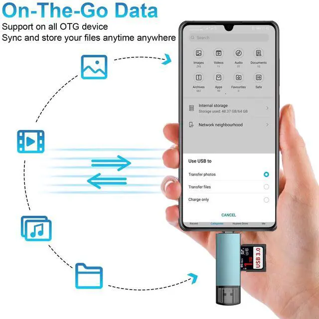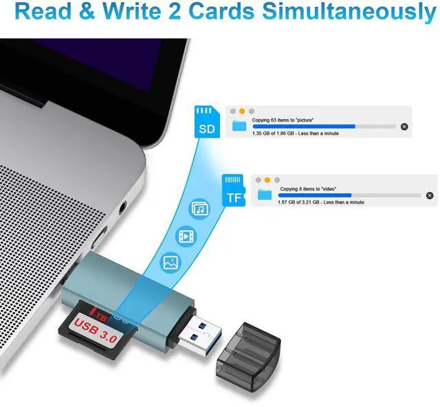 The dual slots support simultaneous reading and writing,allowing access to both SD cards and microSD cards at the same time.Transfer files between cards or devices effortlessly,no need to frequent plugand unplug.
