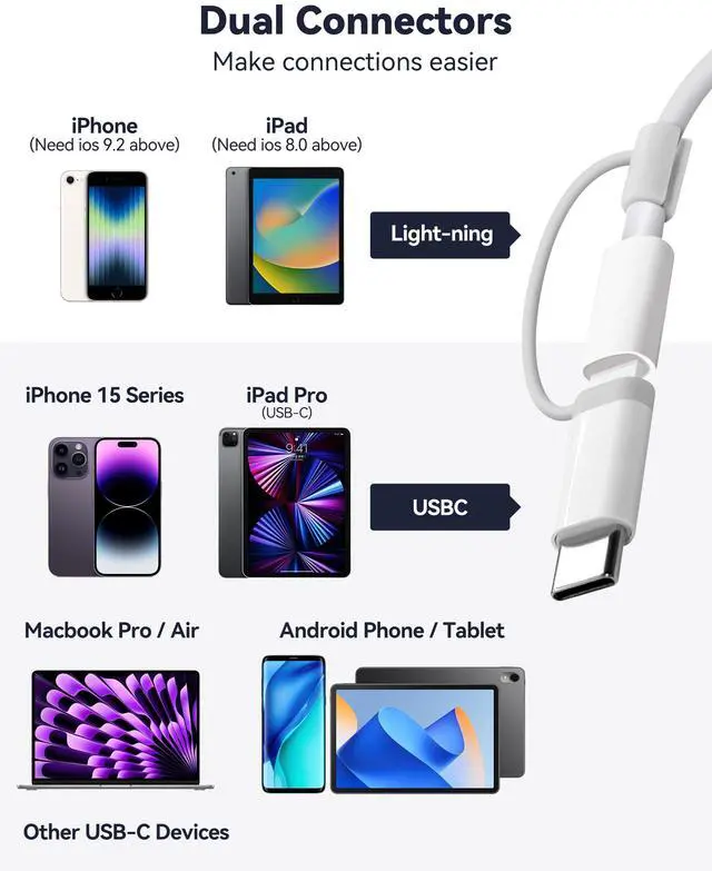 | Dual Connectors | Suitable for Lightening & USB-C devices. |