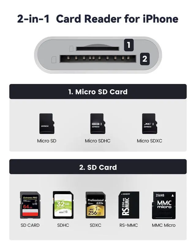 Two interface methods for our SD card reader for iPhone iPad, that not only work with iPhone with lightening ports but also with iPhone iPad/Macbook/iMac and Android devices with USB-C ports.