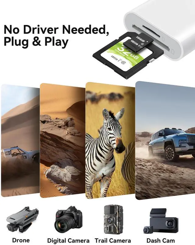 - With our memory card adapter, you can read SD card or Micro SD card taken by digital camera, Dash Cam or Trail Camera.