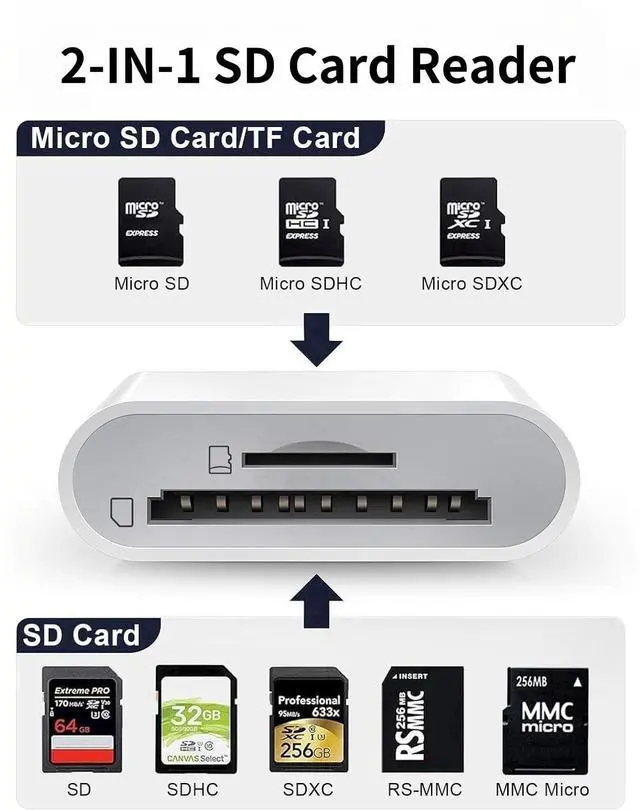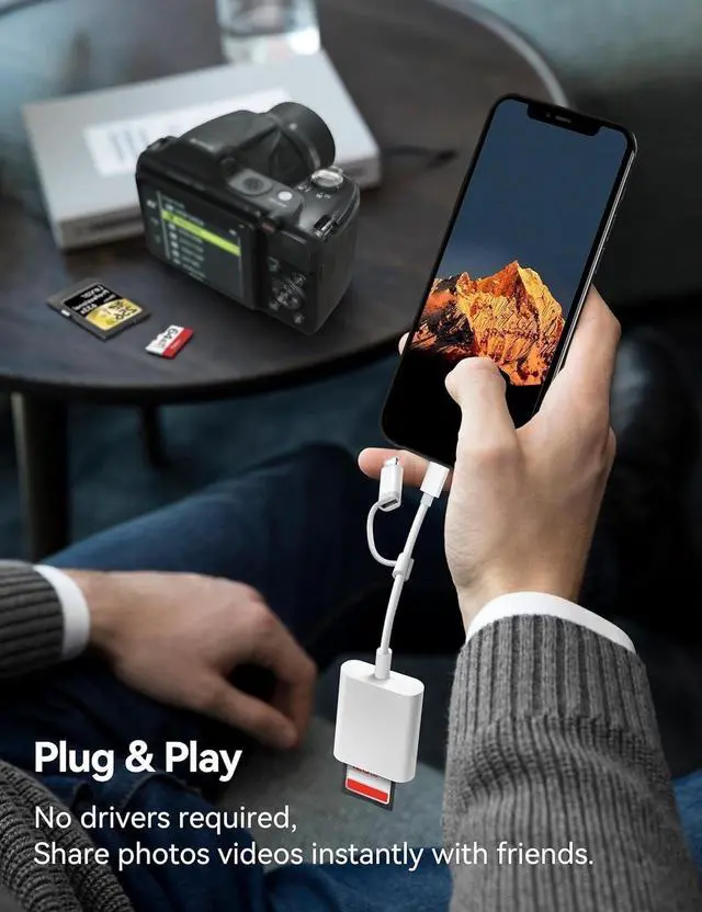 The SD card reader has USB C & Lightning dual connectors, for iphone 5-14, iphone 15-17, ipad, mac, andriod phone, table type c devices.
