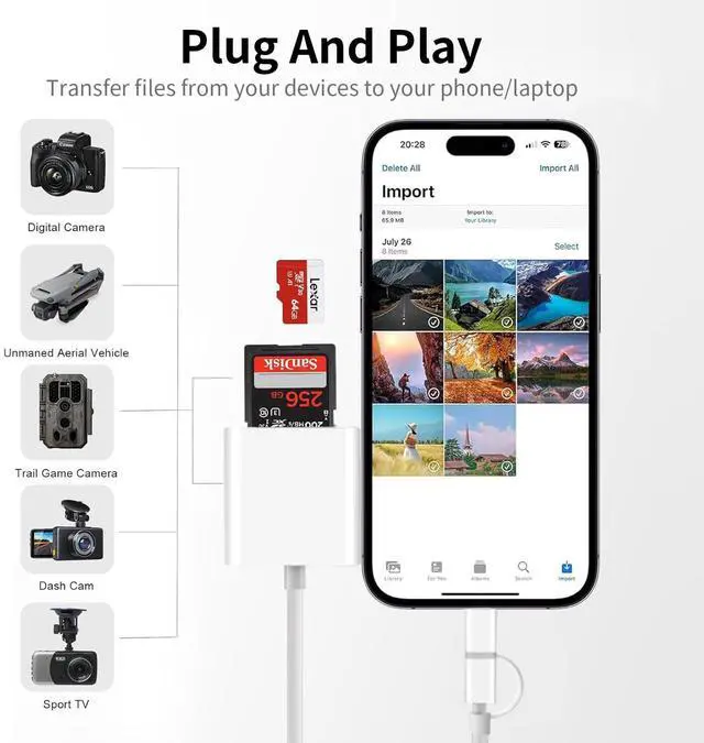 This iPhone SD card reader has a transfer speed of 20 MB/s ~ 30MB/s, allowing you to transfer large amounts of photos and files in seconds.
