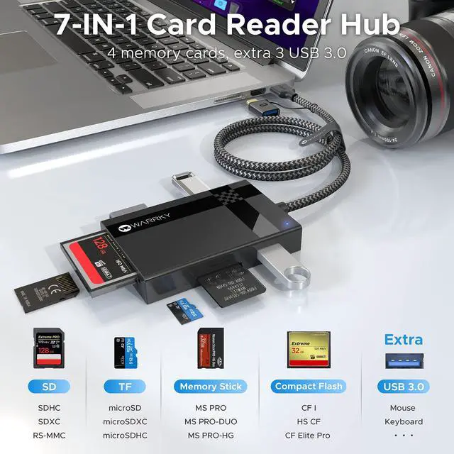 ![Alt view image 4 of 7 - SD Card Reader 7 in 1, WARRKY [Dual Connector USB3.0/USB C, 2.5FT Nylon Cable] Memory Camera Card Adapter Hub for Micro SD/CF/MS/UHS-I, Fit for iPhone 17, Camera, MacBook Pro/Air, Mac, iPad, Android](https://c1.neweggimages.com/productimage/nb640/C5TPD2603200EB3513C.jpg)