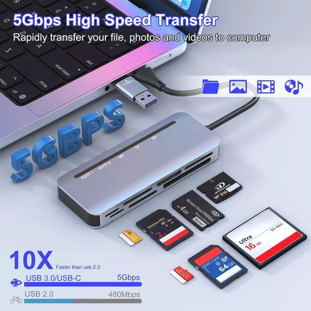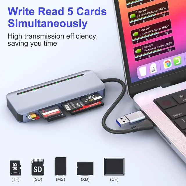 One Reader, Five Cards at Once--For Your SD, TF, CF, MS (Memory Stick), and XD cards.--You can read and transfer files across up to five different memory cards at the same time.