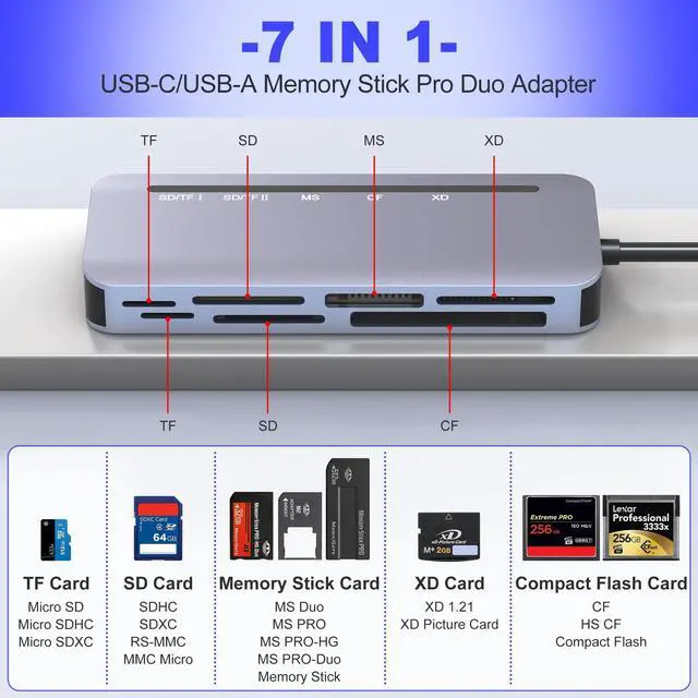 The 7-in-1 Multi sony memory stick pro duo adapter is your all-in-one solution for fast, reliable photo and video transfers.