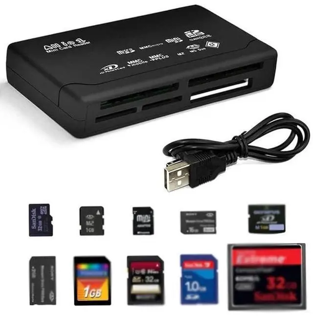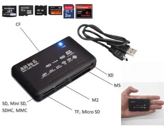 *USB 2.0 SD TF CF XD MS MMC Memory Card Reader *Supports system: casement 98/ 98SE/ME, casement 2K/XP *View and edit images and other files directly on the card reader *Up to 480 Mb (480 Mb/s) data transfer rate per second and up to 12 Mbps transmission bandwidth *Plug and play, supporting hot swap *Portable, easy to use *USB2.0, compatible with USB1.1 *USB interface, no external power supply required *There are LED lights to display read and write status *Repeatable reading and erasing: CF type I/II, CF-Ultra II, CF-Extreme, MicroDrive, Memory Stick, Memory Stick Pro,MS(MG),MS Pro (MG), HS MS Pro (MG), MS Pro Ultra, MS Rom, Secure Digital,SD-Ultra II, Mini Secure Digital, Multi-Media Card, Mini SD,RE-MMC, HS-MMC, T-Flash, X-card, SMC and more