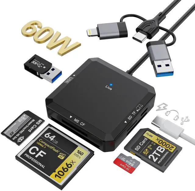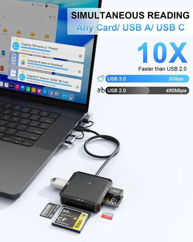 All-in-One Multi Card Reader Versatile Use This 8-in-1 external memory card reader combines USB-C, USB 3.0 and multiple slots (SD, TF, CF, MS) to support nearly all card formats. Perfect as a usb memory card reader for laptop, camera card reader for photographers, or sd card reader for android phone, it simplifies your digital workflow and keeps all devices connected seamlessly.