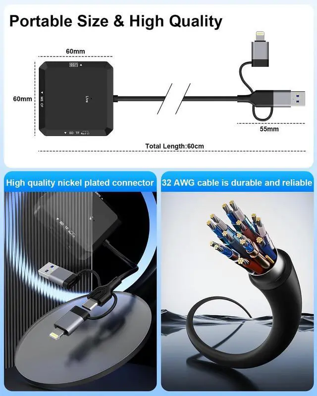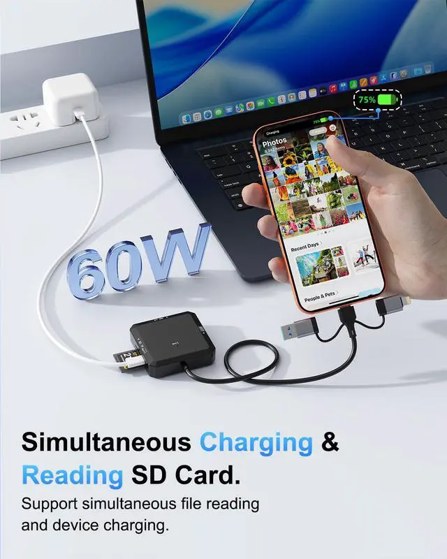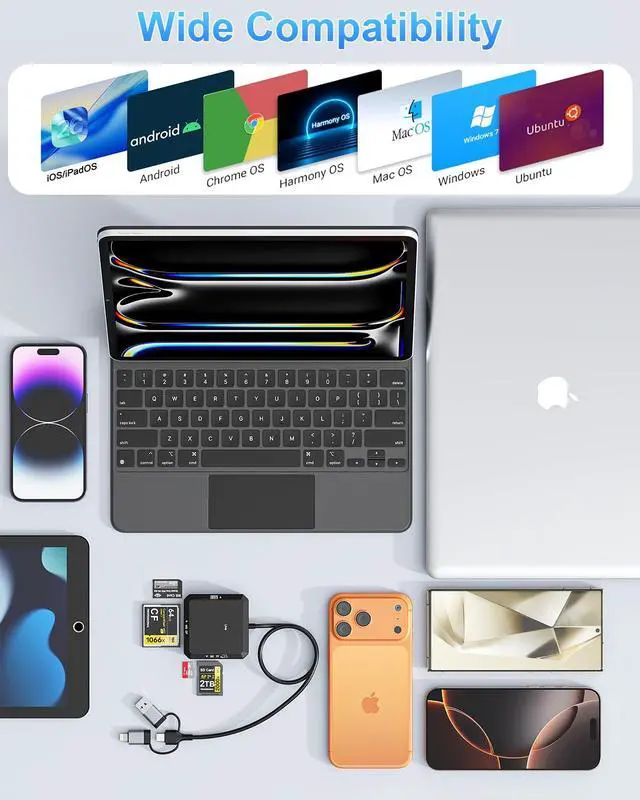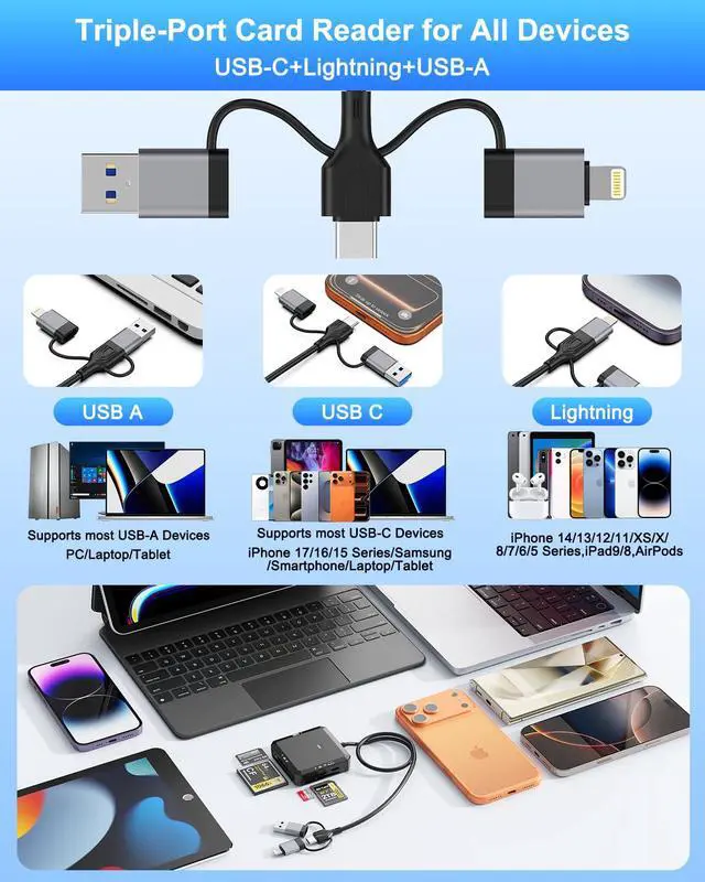 3-Port Connectivity Universal Design for Apple, Android & Laptop Equipped with USB-C, USB-A and Lightning ports, this multi card reader offers ultimate flexibility for Apple, Android and laptop users. It works seamlessly as a usb sd card reader or lightning sd card reader, supporting iPhone 17/16/15, iPhone 14/13/12/11/X, MacBook, Dell XPS, iPad Pro, Sony Xperia, Galaxy and Google Pixel. A true universal solution for expanding devices instantly.