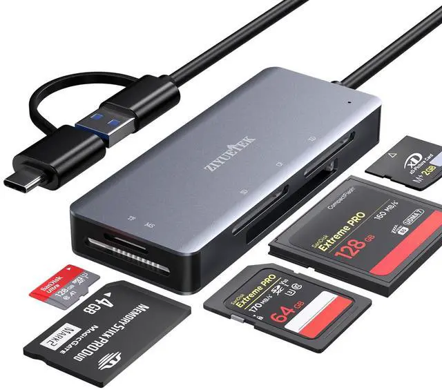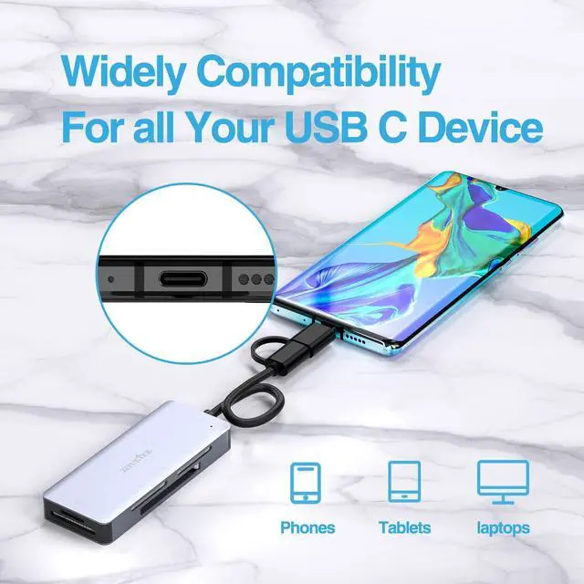 The output end supports USB A and USB C and is compatible with all desktops, laptops, most Android phones and tablets. The input end supports SD, Micro SD, Sony Memory Stick, XD card and Compact Flash. This card reader is sufficient for your daily needs.