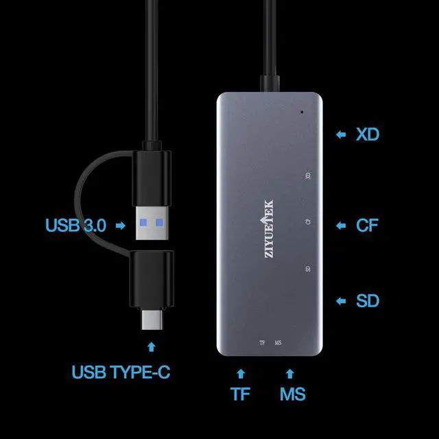 This card reader supports five types of data cards, including SD, Micro SD, CF, Sony Memory Stick and XD. It can read and write these five types of cards simultaneously and comes with two interfaces: USB-A and USB-C. It is plug-and-play without the need for drivers, allowing you to use it on a variety of devices.