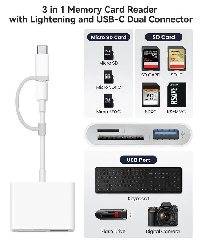 Supports connecting peripherals such as digital cameras, USB flash drives, mice, keyboards, electronic keyboards, MIDI keyboards, and more. You can easily use the SD card reader as a USB expansion port, providing more connectivity options for your iPhone or iPad.