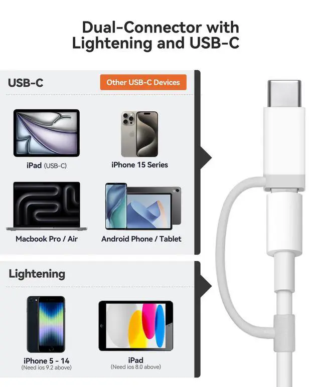The Lightening and USB-C dual plugs design provides broad compatibility for more efficient access to iPhone, iPad, Mac, laptops and Android phones or tablets .