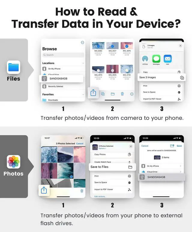 With this adapter, you can read the USB flash drive directly with your iPhone and don't have to read it through a computer. Open "Files" app and you can read and manage the files in your USB flash drive.