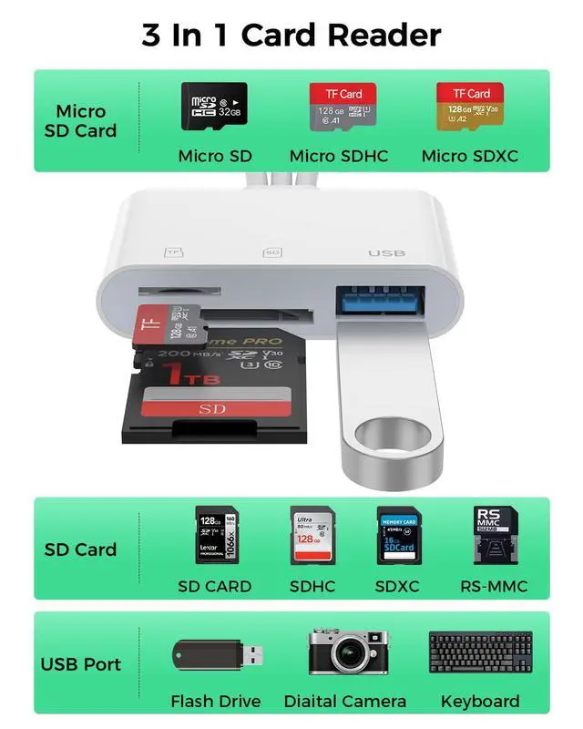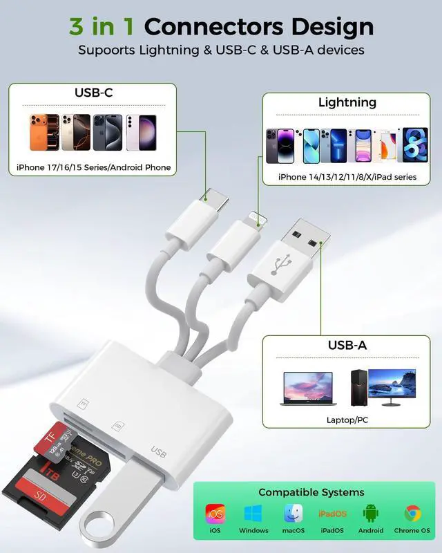 [3-in-1 Universal Compatibility] Say goodbye to carrying multiple dongles! Our premium sd card reader features USB-A, Type-C, and Lightning connectors in one sleek device. Whether you need a reliable sd card reader for iPhone 17, an everyday sd card reader for iPhone 13, or a versatile sd card reader for iPad, this adapter covers it all. It perfectly bridges the gap between your older Lightning Apple devices, the newest Type-C models, and traditional USB-A laptops or PCs!