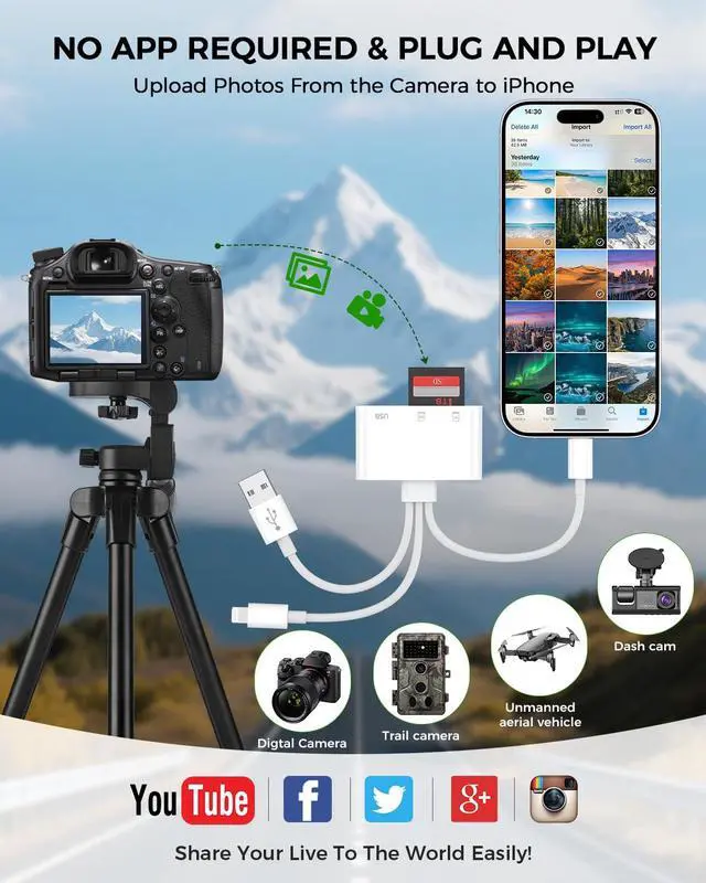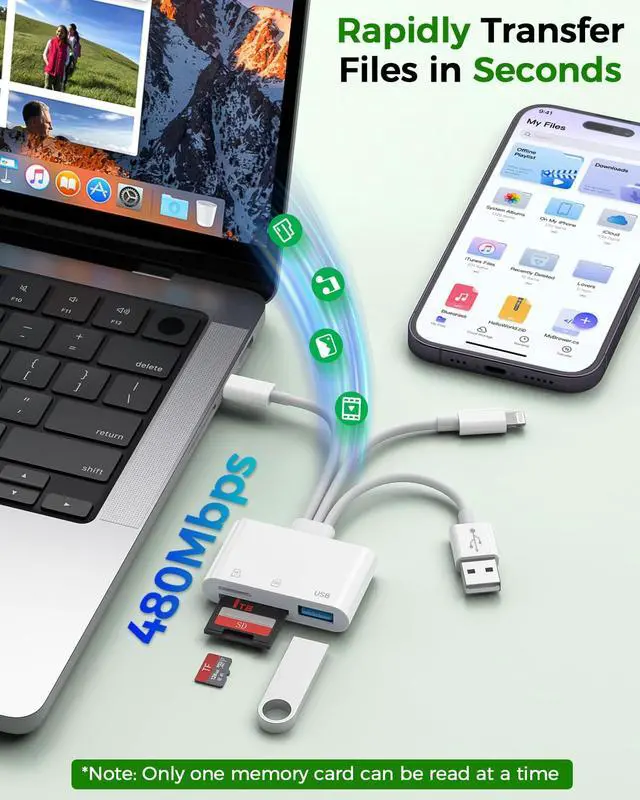 [Plug & Play, No App Required] Instantly access and manage your files with zero setup. Functioning as a high-speed sd card viewer for iPhone and sd card tablet viewer, simply plug it in and open the native "Files" or "Photos" app. This intuitive lightning sd card reader requires no Wi-Fi, cellular data, or third-party drivers. A must-have memory card reader for iPhone and Type-C users who value data privacy and ultimate convenience.
