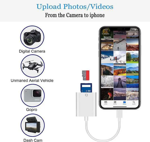 • Formats and Capacity Support:The lightning to memory card Converter supports standard photo formats (including JEPG and RAW) and SD and HD video formats (including H.264 and MEPG-4). supports sd cards from Digital Camera, Sports Camera, Drone, Trail game Camera. This SD card to Phone adapter allows you to share the great moments to social media in real time.