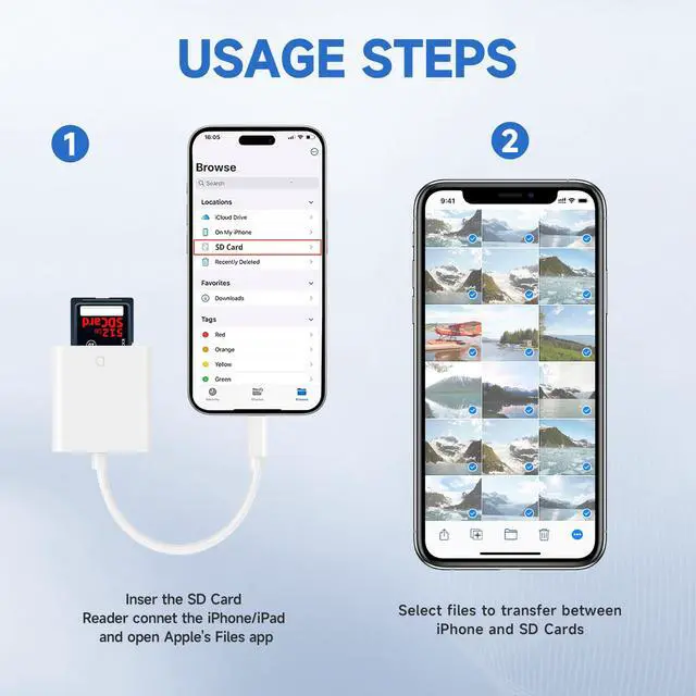 This SD card camera reader is compatible with a wide range of iPhone models. It support iPhone 6-14 Series and various iPad models, including Pro, Mini, and SE editions. It is also compatible with iPad Air 2-5, Mini 2-6, and Pro 9.7-12.9 inch models.