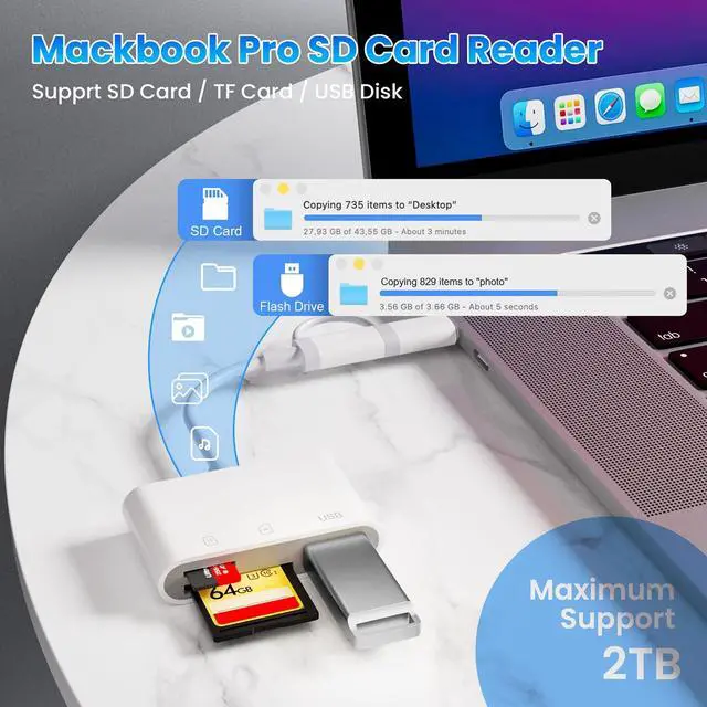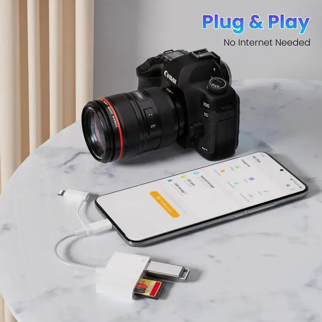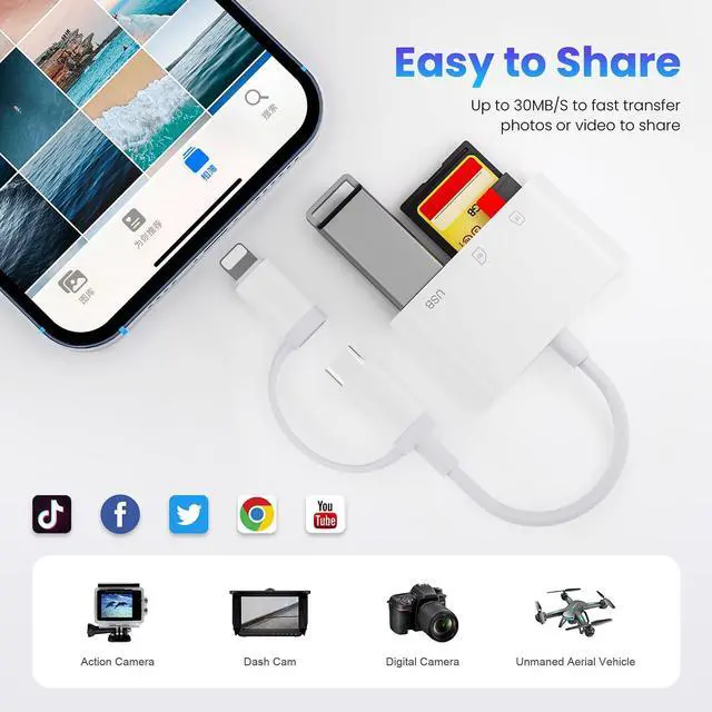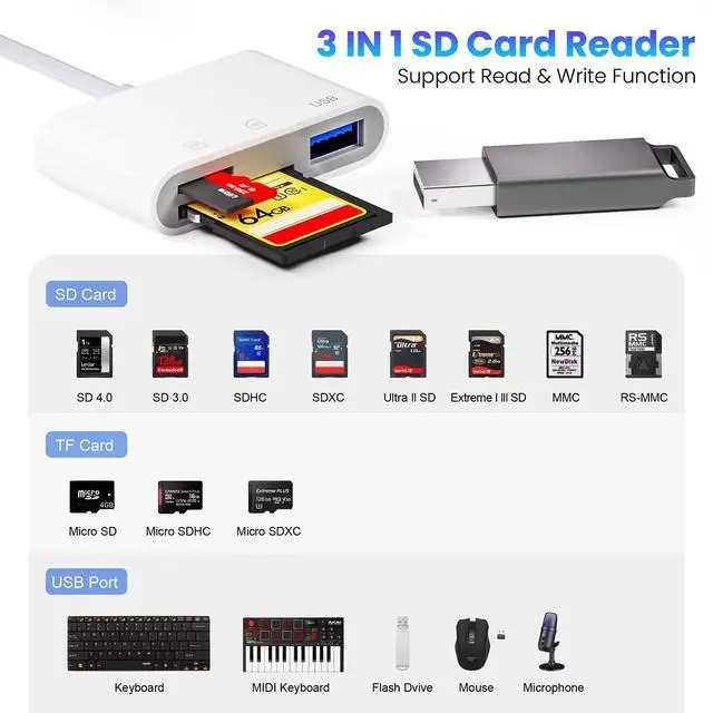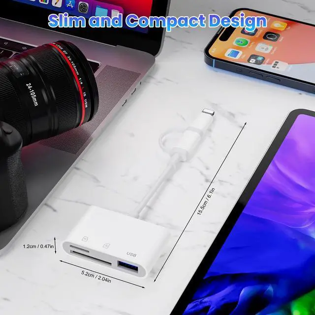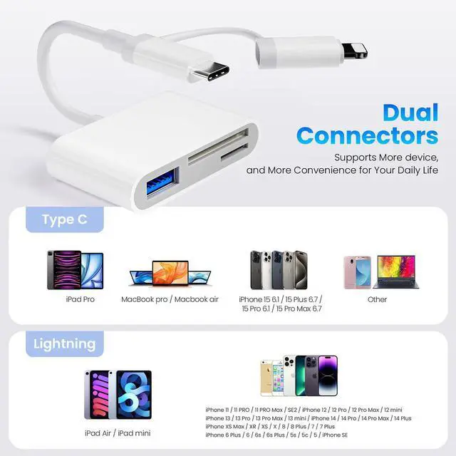 Dual-Port Versatility: This SD Card Reader include USB-C OTG adapter that are compatible with your iPhone whether it has a Lightning connector or the latest USB-C connector. including iPhone, MacBooks, Pad pro, S20/30, Dell and other Type-C enabled devices.