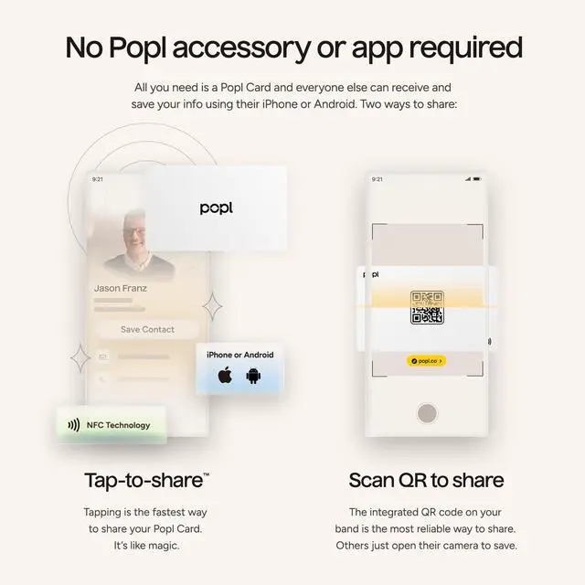 • Smart Business Card: Share your digital information instantly with Popl. Our electronic business card is NFC-enabled for smart business making it easy to connectjust tap or scan the built-in QR code. Fully compatible with both iPhone and Android, Popl is the simplest way to share who you are, anywhere.
