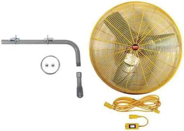 High-Visibility Industrial Fan, Blade Dia. 24 in, Stationary, Non-Oscillating, 2 Speeds, Voltage 115V AC, 1 Phase, CFM High 6100, CFM Low 3800, Air Velocity @ 20 Ft. 520/365, Motor HP 1/3, Motor RPM 1075/600, Operating Amps 3.28 / 2.29, Fan Mounting Location IBeam, Post, Fan Accessory Style High Visibility, Fan RPM 1075/750, Sound Level 74dBA, Max. Ambient Temp. 104 Degrees F, Hz 60, Motor Type Permanent Split Capacitor, Drive Type Direct, Outside Dia.