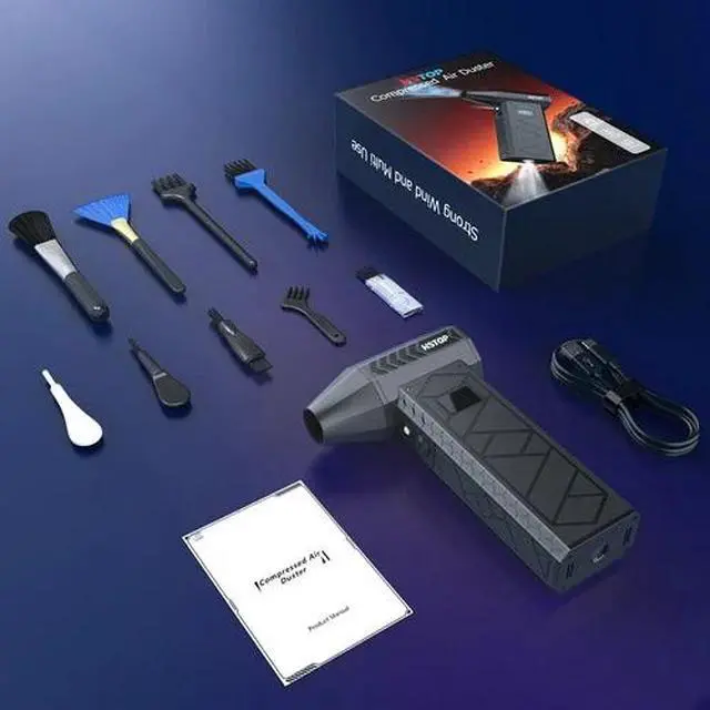 The air duster rechargeable kit includes a USB cable, and Type-c charging is very convenient. It has a built-in large-capacity battery of 10000mAh.Usage steps:Confirm whether it is charged after turning on the product, and observe whether the power display light is on when charging.It needs to be charged with an original USB cable, and do not use an unmatched USB cable,which will damage the battery.Note:The charging protection mechanism is set and cannot be used while charging,Equipped with a display screen, the battery level can be checked at any time
