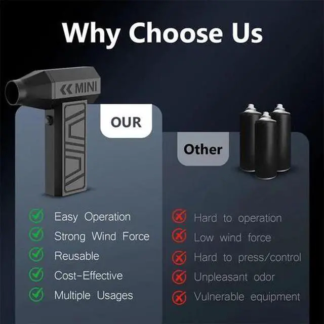 Multi-use:The compressed air duster is equipped with 2different nozzles, suitable for various occasions, to meet different cleaning demand. This compressed air duster it's can cleans crumbs, hair and dust from PC, keyboards, sofas, fax machines, printers, and air conditioners,It's the perfect choice for household, office, and car dust cleaning.