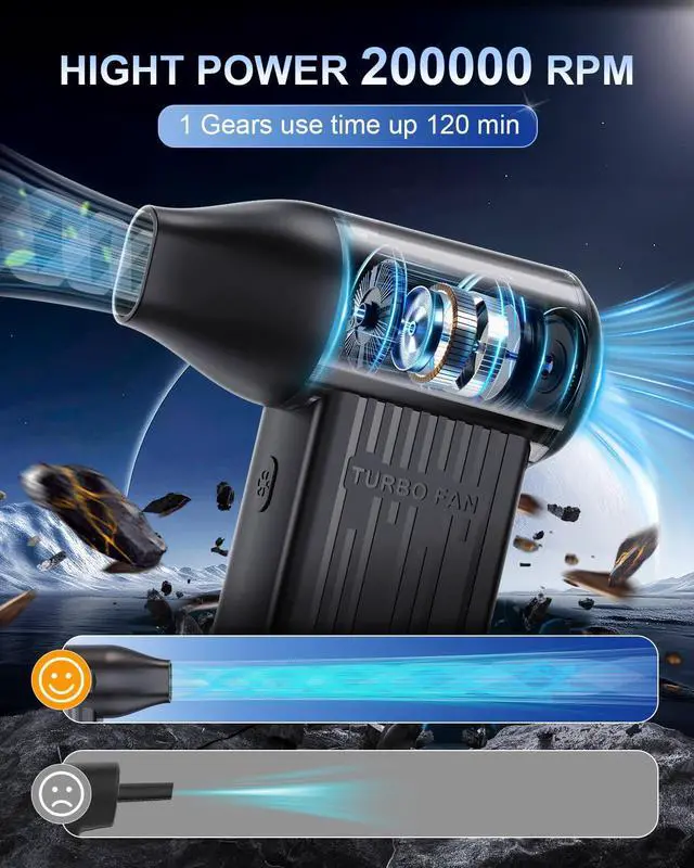 The Compressed Air Duster is equipped with a 4000mAh capacity,you can enjoy up to 300 minutes of use on the lowest setting