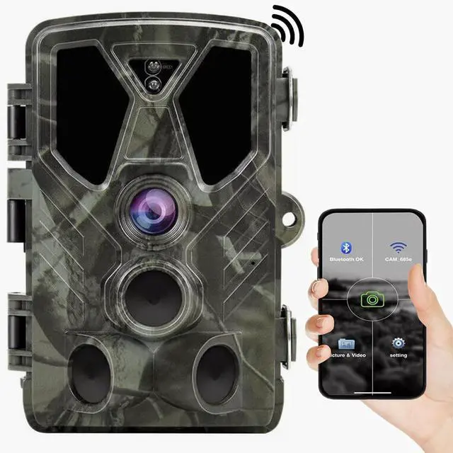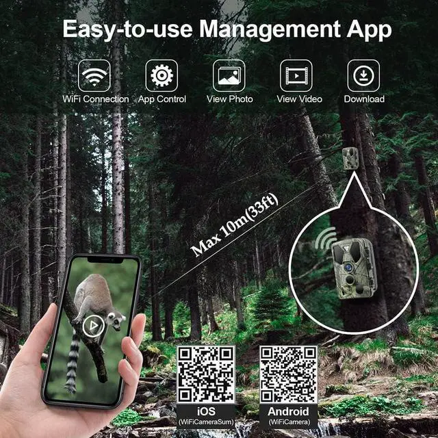 With a hotspot connection, you can preview and download trail camera pictures and videos on your smartphone APP. The larger the file, the longer the Wi-Fi transfer will take. For large files such as 4K videos, we recommend using wired transfer for better results. (Tip: This hunting camera is not a cellular camera, WiFi connection and APP control have range limitation, usually 0-15m)
