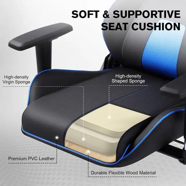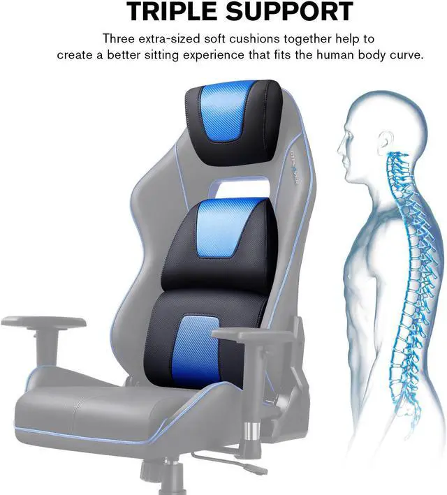 Unlike all those mediocre computer chairs with 2 tiny rocky pillows which squeeze your spine and leave zero support for upper back, this gaming chair is equipped with soft and thick triple support for your entire back which provides a hug feeling fully support while you are sitting. The seat and cushions are filled with high density foam which will not get flat and loose support easily in long-term use. Just sit in it and you will feel the differences.